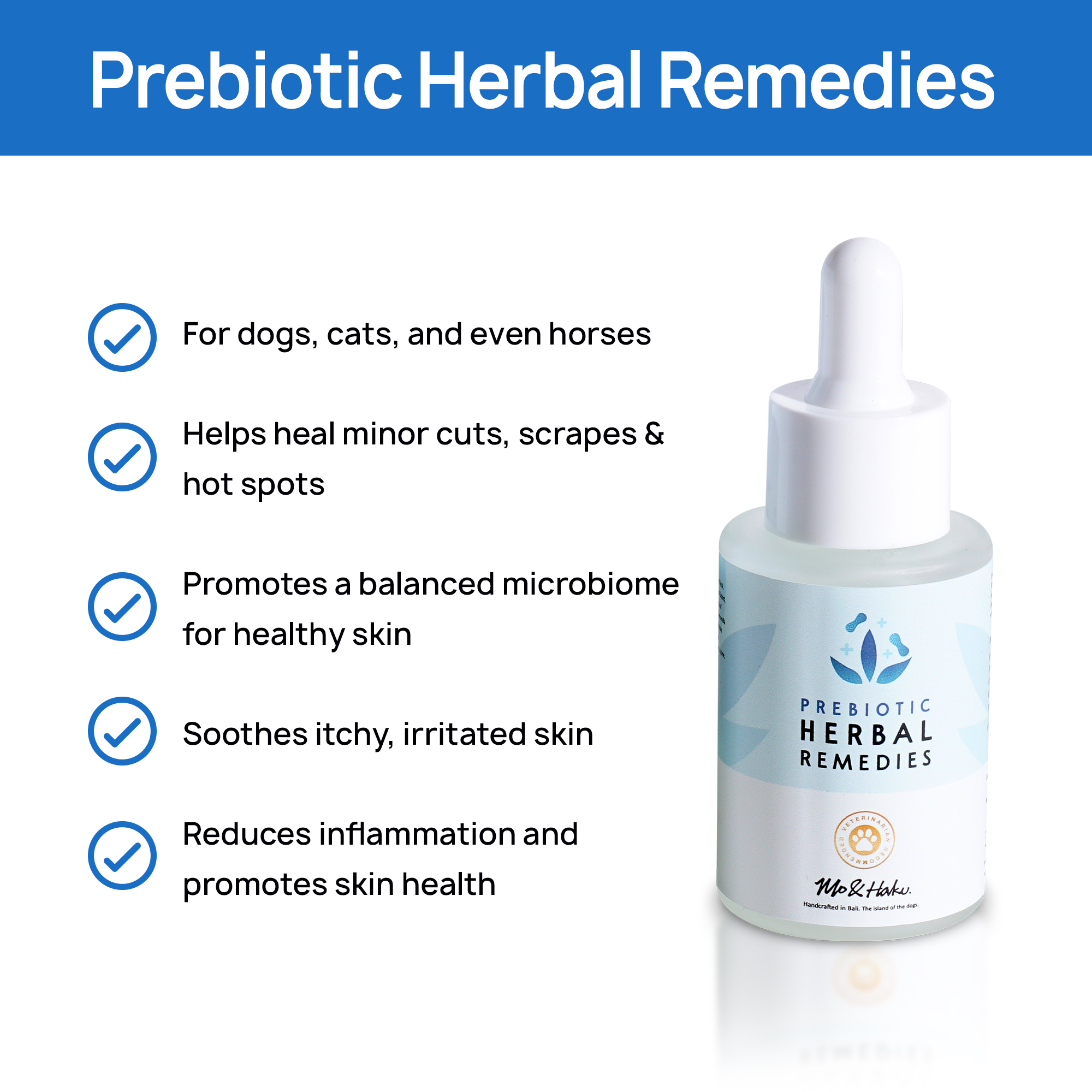 Enhance your dog’s or cat’s skin care routine with our prebiotic herbal remedies.