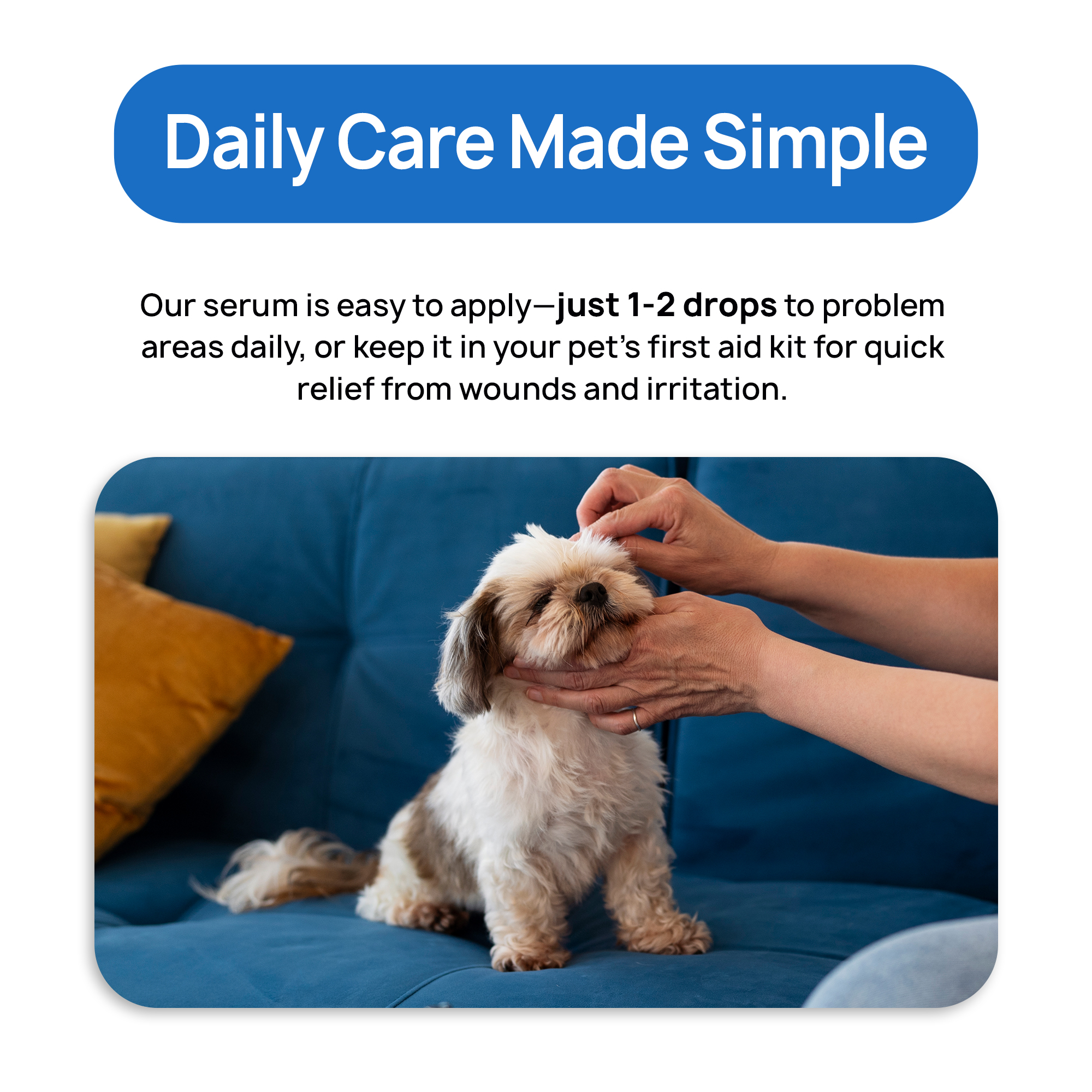 Directions: Apply 1-2 drops of product directly to problem areas or sore spots on your pet’s skin, ensuring even coverage. You can also use a cotton swab to apply the product more precisely.